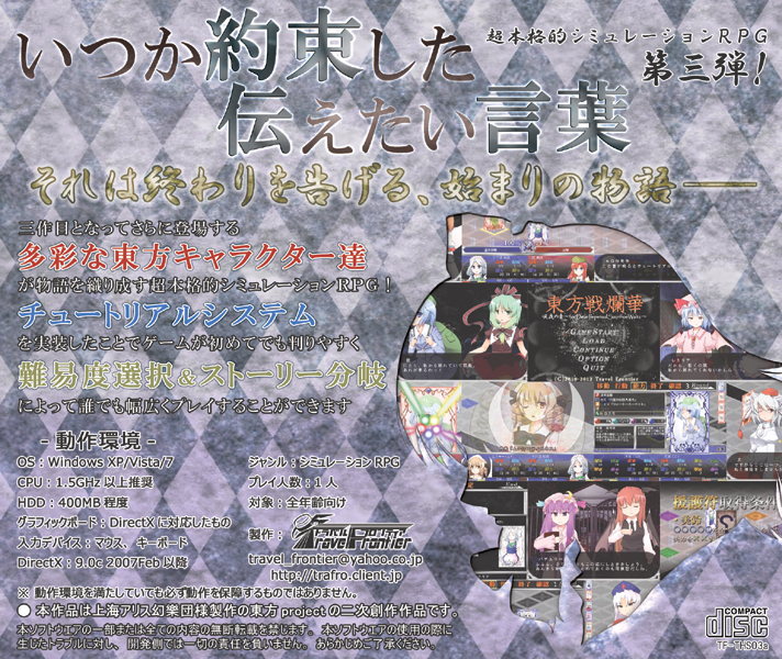週末には大⑨州東方祭、来月には博麗神社例大祭とイベントが目白押しで益々忙しくなる今日この頃です。 ・東方戦爛華 霊夢の章 ~Independence for Oneself~(旧作) イベント頒布価格 500円 内容は特設ページ(http://trafro.client.jp/product/touhou/index.html)を参照下さい。