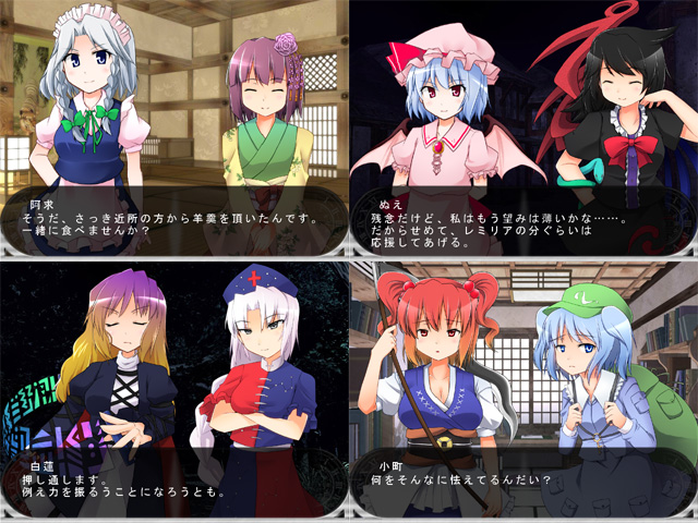 時間が経つのが早いです・・・。 そんなわけでなんと、今回も受かってしまいました。 多分今年の運気を全て使い切ったと思います。 場所は2日目 ホ-49aだそうです。持っていく物は新作の咲夜の章! といいたいところですが、ちょっとどうなるか判りません・・・。 何も無いということは絶対にないので、楽しみにしててくれると、それはとってもうれしいなって。 とりあえず進んでるー的なスクリーンショットでも貼り付けてと。 スクリプト打てるところしかやってないので、会話メインなスクショです。 ネタばれ・・・にはなってないはず! でも珍しいキャラの組み合わせですね。まず本編ではお目にかかれないなあ。 話は変わりますが、前の例大祭のときにお隣さんだったGREEN MORE LIFEさんところの東方地底ダイブが面白かったです。 ままにょにょのシステムそのままで、新しさはない分非常に丁寧に完成されていて、同人ゲームなのに非常に快適でした。パッチもきちんと対応してるし、見習いたいものです。 キャラも多いのに破綻もなく、こういう感じもいいなあと勉強にもなりました。 委託もされているので、気になる人はプレイしてみてください。 あと、咲夜の章の人物紹介ページを地味に更新してます。 ?を入れればもう27名。紹介文も書いてるし、頑張ったなあと・・・。 このままほとんどのキャラ紹介を載せれたらいいですけど、そんなの作る暇あったら、ゲームの製作の方頑張れって話ですよね、精進します;