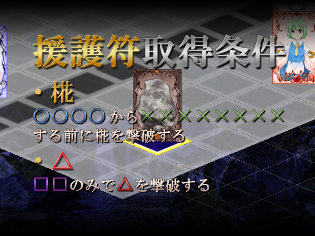 PR 梅雨も明けて毎日が凄い暑いです。夏だなあって思いますね。そんな環境の中、製作の方もぼちぼちと進んでいます。 まずは咲夜の章の登場人物の更新をしておきました。詳細はこちら⇒ 天界&彼岸組ですね。天子と衣玖は前作で出番ありましたが、小町は今回から初参戦です。 一番に出番がありそうなキャラなのに、出番が最後という珍しい立ち位置。活躍の方を楽しみにしていてください。 他には追加のシステム紹介など。今回から援護符の取得に条件が課せられるようになりました。先行体験版をプレイした方は気づいたんじゃないかと思います。 見て判るとおり、文字を伏せて判りにくくなっていますが、この条件を満たせば援護符を取得できるというもの。 話を聞いてれば判るものだったり、結構予想しやすいものにしてますから、そんなに難しくは無いかもしれません。 援護符なんで、無理にとる必要も無いですが、ちゃんと取得しておくと後でいいことがあるとか無いとか・・・。 夏コミには完成が間に合いそうに無いので、次は紅楼夢か冬コミか。内容が今までの作品よりも2倍濃い分、結構まとめるのが大変です。待たせる分、もっと面白くなるよう頑張ります。夏コミにしても何か新しいものを用意するので楽しみにしていてください。 それはそうと来週が大⑨州祭4ですね。 こちらのイベントにも参加します。場所は神の7ですね。 ちゃんとしたお品書きはまた後日書きますが、前の例大祭で配布した無料体験版がまだ残っているので、そちらを配布しようかと思っています。よろしくお願いします。 そして最後になりますが、現在トラベルフロンティアではプログラミングの出来る方を募集しております。 詳しくはこちらのページをご覧下さい。⇒プログラマー募集 システムの方はほぼ出来上がっていますので、それに手を加えたり、不具合に対処してもらったりとそういったことがメインになります。興味のある方は一度連絡して頂けると嬉しいです。 あまり更新してなかったので一気に書いてしまいました・・・。 そろそろ他のサークルさんも夏コミに向けた宣伝をする時期だと思うので、ウチも負けずに色々と情報を公開していきます。それではまた週末に。